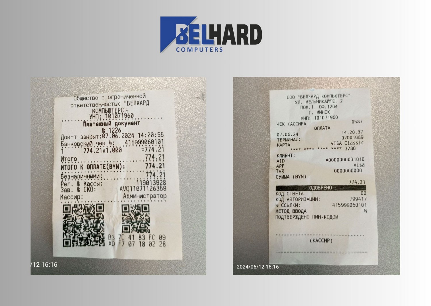 Вы можете оплатить заказ наличными в нашем пункте самовывоза или курьеру. После оплаты вы получаете кассовый чек (образец чека).Банковской картой через терминал